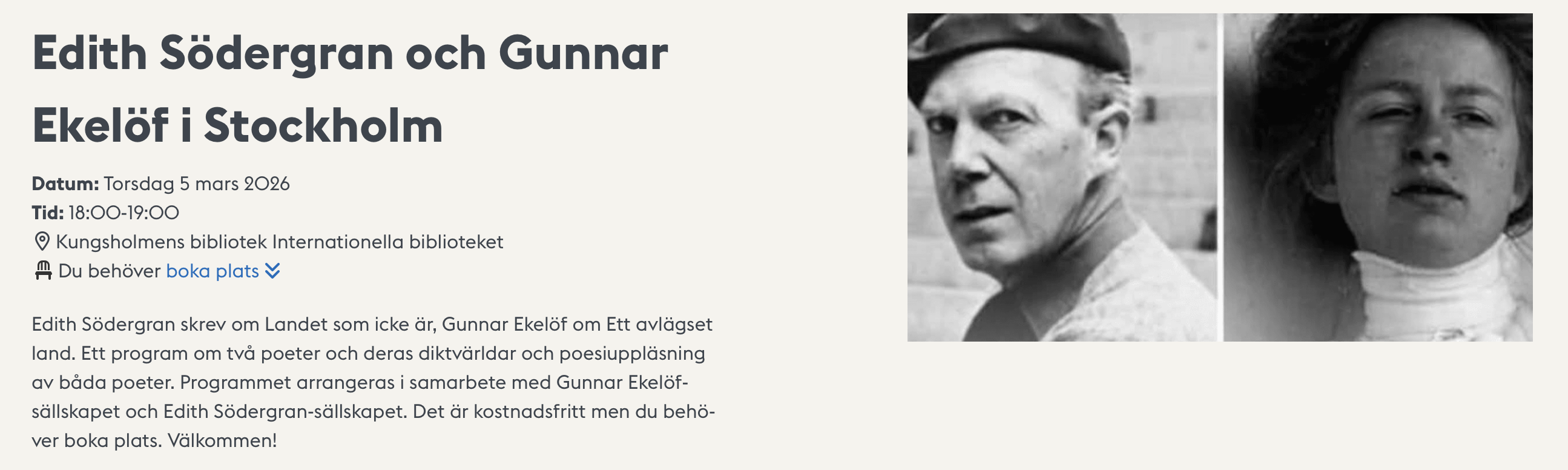 Den 4 och 5 mars blir det evenemang kring Gunnar Ekelöfs relation till Edith Södergran. På Finlandsinsitutet (Snickarbacken) möts de två diktarna i uppläsningar av skådespelarna Stina Ekblad och Hannes Meidal, och det blir även ett speciellt utvalt musikprogram. Det är på kvällen den 4 mars, och biljetter kan förhandsbokas hos Berwaldhallen, som är medarrangör tillsammans med Gunnar Ekelöf-sällskapet. Dagen därpå, den 5 mars, kl 18, samtalar John Swedenmark med Södergransällskapets ordförande Marit Lindqvist om resan till Södergrans hemort Raivola år 1938. Det programmet äger rum på Internationella Biblioteket på Sankt Eriksgatan: mer information och länk till förhandsanmälan står här nedan (begränsat antal platser)!